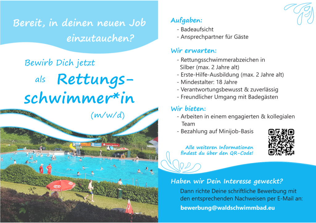 Das Waldschwimmbad ist eine kleine Idylle inmitten von sattem Grün, eingerahmt von Wald, Wiesen und Feldern. Auf großzügigen Liegeflächen findet Jedermann seinen Platz – sonnig, schattig, ganz nach Belieben. Der Kioskbetrieb bietet nicht nur das Nötige um bei Kräften zu bleiben, von hier aus hat man auch einen hervorragenden Blick über das gesamte Schwimmbad.